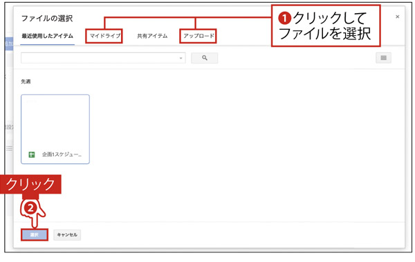 Google ドライブ内のファイルを選択するなら「マイドライブ」をクリックする。パソコン内のファイルを選択するなら「アップロード」をクリック。選び終えたら「選択」をクリックする。