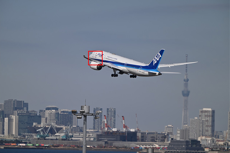テイクオフして遠ざかる旅客機。すでに画面内ではさほど大きく写らないし、アングルもやや斜め後ろから。こんな条件でも被写体検出は、しっかり先頭部を捉えてくれた。