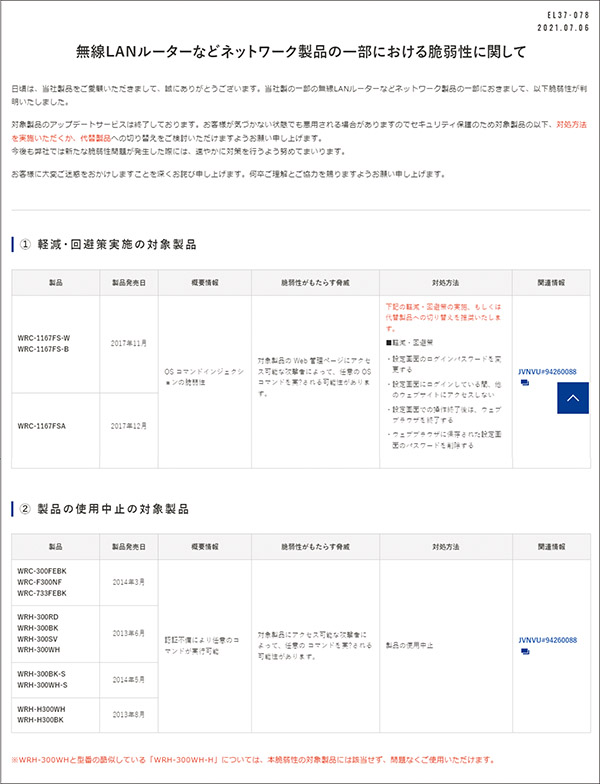 例えば、2021年7月にエレコムでは同社の複数ルーターに脆弱性があることを発表。最新ファームウエア適用によるアップデートを推奨する一方で、サポート切れの一部製品については買い替えでの対応を訴えている。