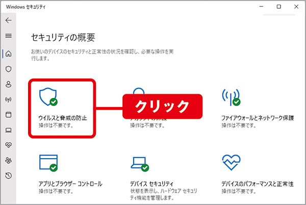 スタートメニューから「Windowsセキュリティ」を起動する。「セキュリティの概要」画面で、各項目に「操作は不要です。」と表示されていれば問題ない。マルウェア対策機能の設定を行うには「ウイルスと脅威の防止」をクリック。