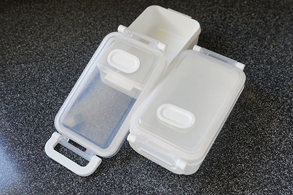 ダイソーで購入した「保存容器としても使えるお弁当箱」。3つのサイズがありますが、もっとも小さい300mlタイプを2つ購入しました。