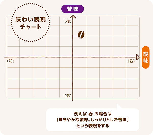 コーヒーの味わいを楽しむ大きな要素はこの五つ。特に「酸味」と「苦み」の強さは味わいの方向性を示す大きなポイントになる。