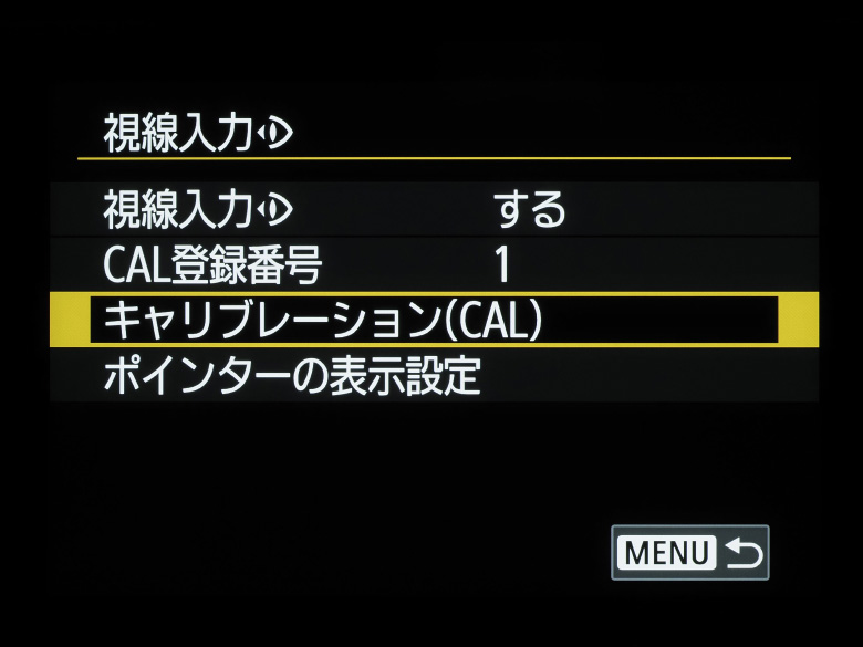 視線の特性をカメラに登録する作業「キャリブレーション」の設定画面。自分は遠近両用メガネを使用するので、視線入力との相性は良くないはず。だが、撮影状況に応じて何度もキャリブレーションを繰り返す事で、精度を高める事ができた。