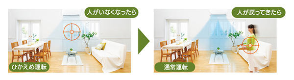 不在時ひかえめ運転では、人感センサーが人の不在を検知すると、約15分後に自動でパワーをひかえめにしてくれる(部屋に人が戻ったら通常運転に戻る)。