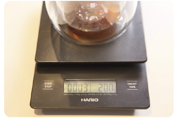 (6)蒸らしのための湯の量は約20g。これくらいの湯を注ぐと、サーバーにポタポタと抽出されたコーヒー液が落ちてくる。