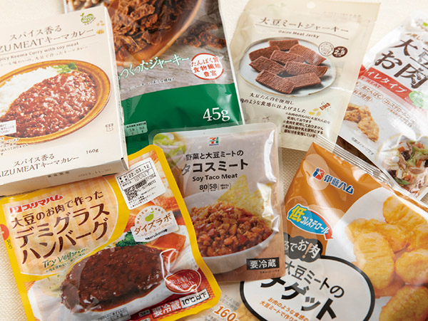 スーパーやコンビニで買える大豆ミート製品の一例。いろいろなメーカーが、大豆ミートを使ったレトルト食品や加工品を出している。外食チェーンやファストフード店でも、大豆ミートのメニューがある。