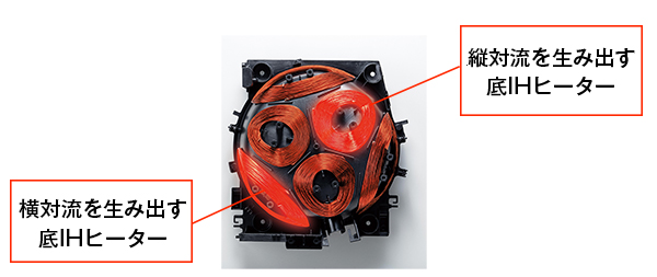 底IHヒーターは加熱範囲を6ブロックに分け、2つのヒーターを対角線上で同時加熱。部分的な集中加熱を繰り返すことで、上下だけでなく、左右の激しい対流を引き起こし、釜の中心部までかき混ぜる。