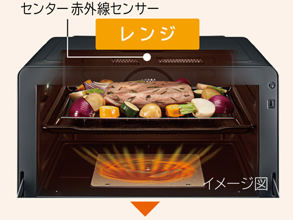 「センター赤外線センサー」が食品の表面温度を見極めるため、分量にあわせた調理ができる。レンジ過熱ですばやく食品の温度を上げる。