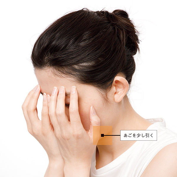 ❶あごを少し引き、小指、薬指、中指、人差し指の腹を両眉の上に置く(ゾーン(1))。親指はどこでもよい