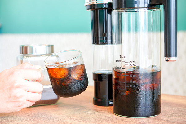 注ぎ口が付いているガラスボトルから抽出したコーヒーをカップに注げば、好みに合わせて抽出した水出しコーヒーが楽しむことができる。ガラスボトルはスリムな形状を採用しており、そのまま冷蔵庫に入れて冷やすことも可能だ。