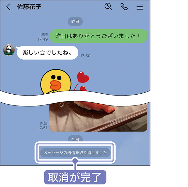 取消が完了した。ただし、送信を取り消した旨が表示されるので、トーク相手にも伝わる。