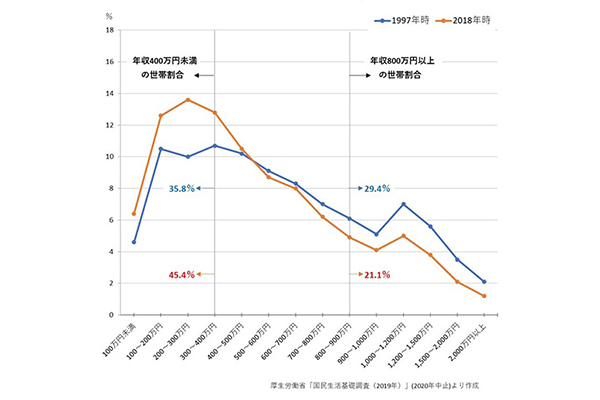 この約20年間に、年収800万円以上の世帯が29.4→21.1%(8.3%減)となった一方で、年収400万円未満の世帯は35.8→45.4%(9.6%増)となりました。まさに「格差」や「2極化」という言葉が当てはまるような状況が進んできたことも分かります。