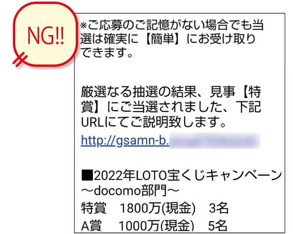 心当たりのないメールへの返信は禁物。また、メールにあるURL(青く表示されるウェブサイトのアドレス)も絶対にタップしてはダメ!