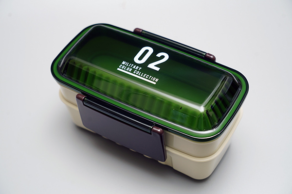 「ランチボックス(ドーム型・2段・900ml)」の注意書きには「本品は完全密閉の容器ではありません。」と明記されているので、完全密閉ではないのでしょう。しかし、透明グリーンのフタにはしっかりとシリコーンゴムのシーリングがついており、ABS樹脂製のロックでふたつの容器がしっかりとロックされる構造です。