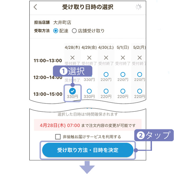 まず、受け取り日時の設定が必要になる。「○」か「△」をタップして都合のいい日時を選んだら、「受け取り方法・日時を決定」をタップ。