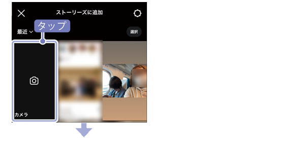 「カメラ」をタップすると、カメラが起動して撮影できる。保存済みの写真や動画を使うことも可能。