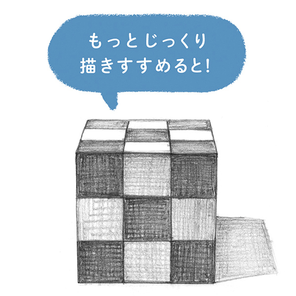 この積み木は小さな立方体の集合体のため、まず全形として大きな立方体を描き、それに沿ってひとつひとつのブロックのディテールを描き加えると素早く描けます。