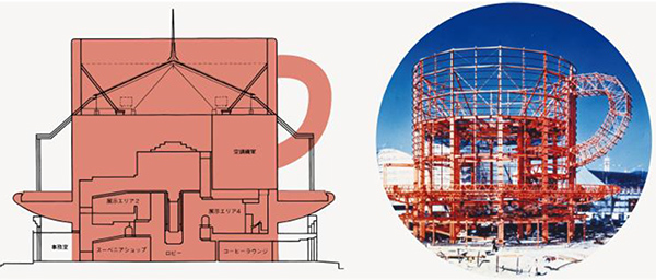 直径 35 メートルのソーサーに、直径 22 メートルのカップが載るこのパビリオンの姿は人々の度肝を抜いた。下から見上げる来場者にはわからないが、カップの天面の少し下がった部分が茶褐色に塗装されていて、上空のヘリコプターからはコーヒーがたっぷり入っているように見えるという凝りよう。結果的に神戸ポートピア博を代表するアイコン的な存在になった。