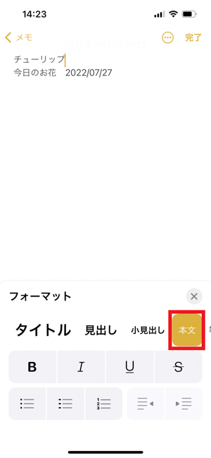 なお、1行目も本文にしたい場合は、1行目をタップし、下部の「Aa」アイコンをタップして「本文」をタップすると、本文の書式に変更される。1行目から本文を入力できる方法もあるので後ほど紹介する。