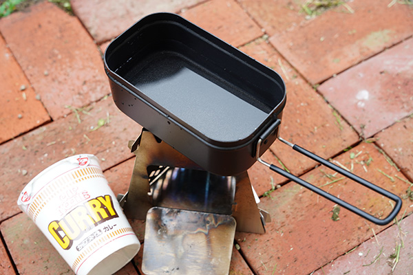とりあえず、困ったときの非常食はカップヌードルだと考えてお湯を沸かしてみました。焚き火台は筆者愛用の「カマド スマート ストーブ <デルタ>」です。