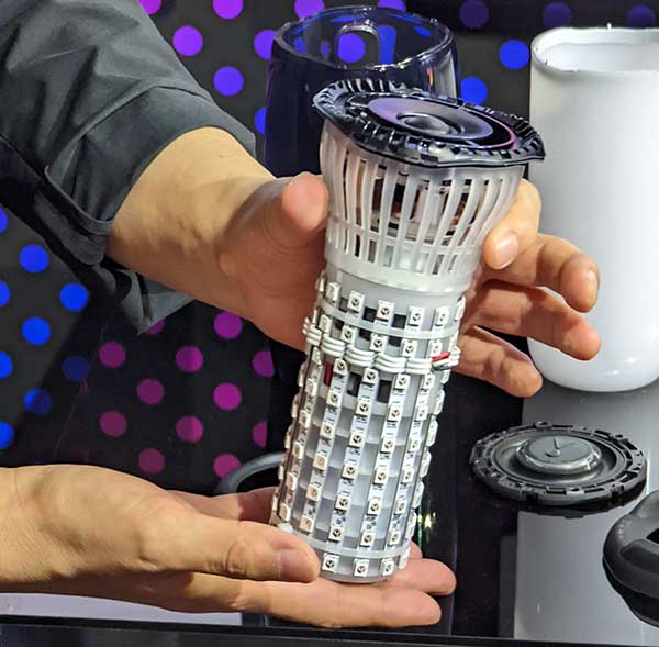 本体に、LEDを140基搭載し、さらにそのLEDを50fpsの高速で変化させることで、滑らかで煌びやかなライトショーを演出することができる。また、本製品より新たに、底面のパッシブラジエーター部にもプロジェクションLEDを9基搭載。接地面に反射する間接的な光が独特な浮遊感醸し出してくれる。シーンに応じて筐体と底面のLEDを消灯することもできるから、さまざまなシーンに合わせて使い方可能だ。