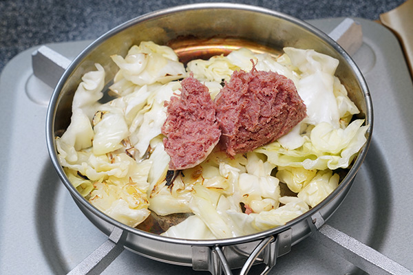 油をひいたフタ兼フライパンで 先にキャベツを炒めておき、キャベツがややしんなりしたところで、コンビーフを半分ほど加えます。