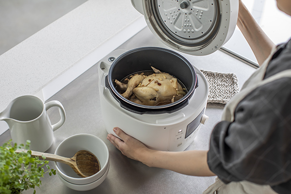 5Lの大容量サイズだから、大人数の家庭にはもちろん、作り置きにも便利で、丸鶏を使ったサムゲタンやローストチキンなど、食材を丸ごと使った料理にも対応可能。また、日々の定番料理から作り置きおかず、世界の料理といったメニューに加え、「低温&圧力調理」で作る「牡蠣カレー」など食材そのもののおいしさを味わえるメニューや、「ベジタブルロス」などフードロスの削減にもつながる食材を無駄にしないメニューなど、100種類の豊富なメニューを搭載している。付属のレシピブックにはオートメニュー対応する100レシピが掲載されているから、毎日の献立にも役立つ。
