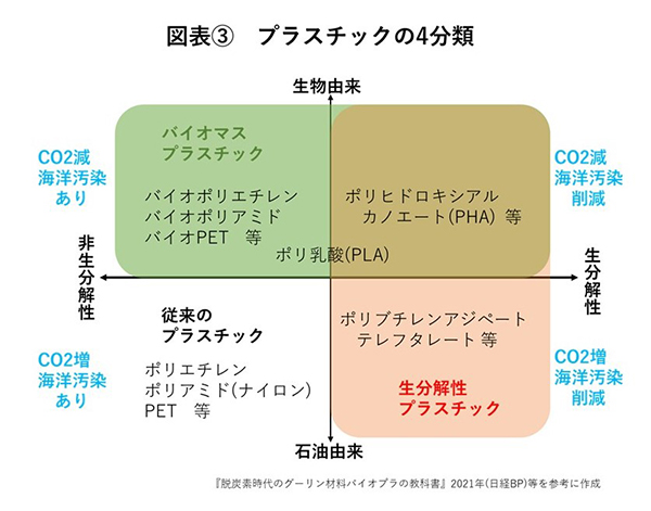 図表(3)のように、生物由来⇔石油由来と生分解性⇔非生分解性の4象限で、プラスチックを分類することができます。