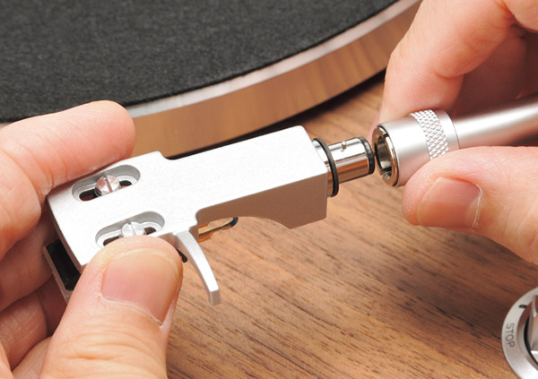 最初に、カートリッジを取り付ける。トーンアームが動かないようにアームレストに固定してから、先端にカートリッジを差し込み、シェルコネクターを回して固定しよう。