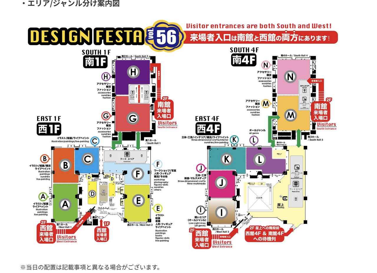 デザフェスで出展されるジャンルは、イラストや写真、ファッション、書籍、パフォーマンス、フードなど多岐にわたります。vol.56ではそれらを西1階と4階、南1階と4階の4つのフロアで展開するのです。