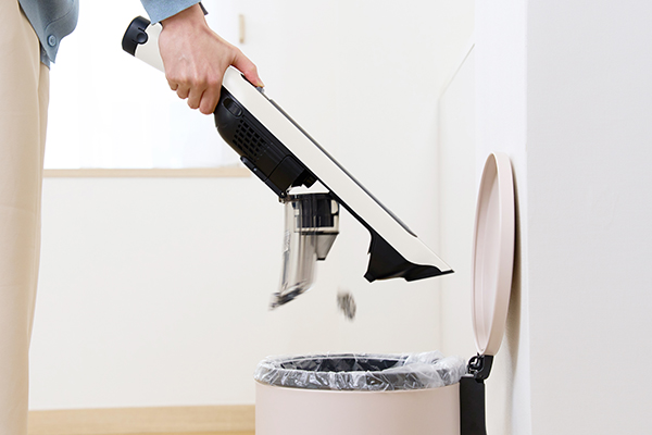 ハンディ時のゴミ捨ては、本体のゴミ捨てボタンを押すだけで簡単にゴミ捨てが可能。ゴミに触れることなく捨てることができるほか、ダストカップやフィルターも水洗いができるから、衛生的で、掃除機本体も常に清潔に保てる。