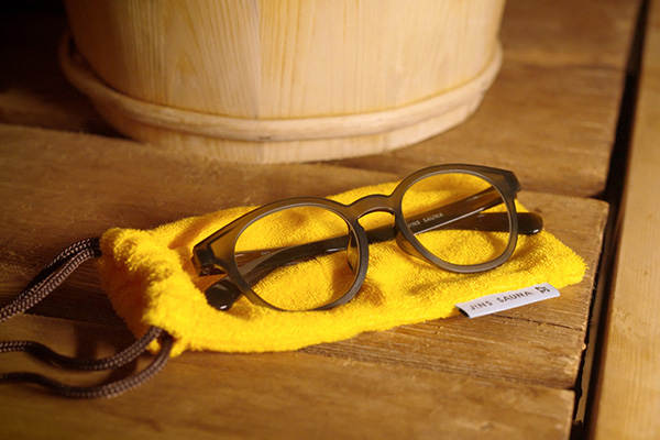 専用のケースは、サウナのマットをイメージしたパイル地のソフトケースだから、メガネ本体を優しく守ってくれるうえ、持ち運びもしやすいようになっている。