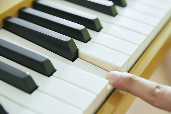実機を目の当たりにして、最初に目に入ってきたのが、"オシャレなカラーリング"だった。そのカラーリングの名称は、"ハーモニアスマスタード"。マスタードのようなカラーに少し緑が混ざったような、ピアノでは、おおよそ使用することのないカラーだ。某自動車メーカーの特別色を彷彿とさせる、私好みの色に感嘆してしまった。ピアノと言えば、ピアノブラックと言われるカラーが存在するほど、黒を基調としたイメージが強い中、まさかの色の登場にワクワク感がとまらなかった。