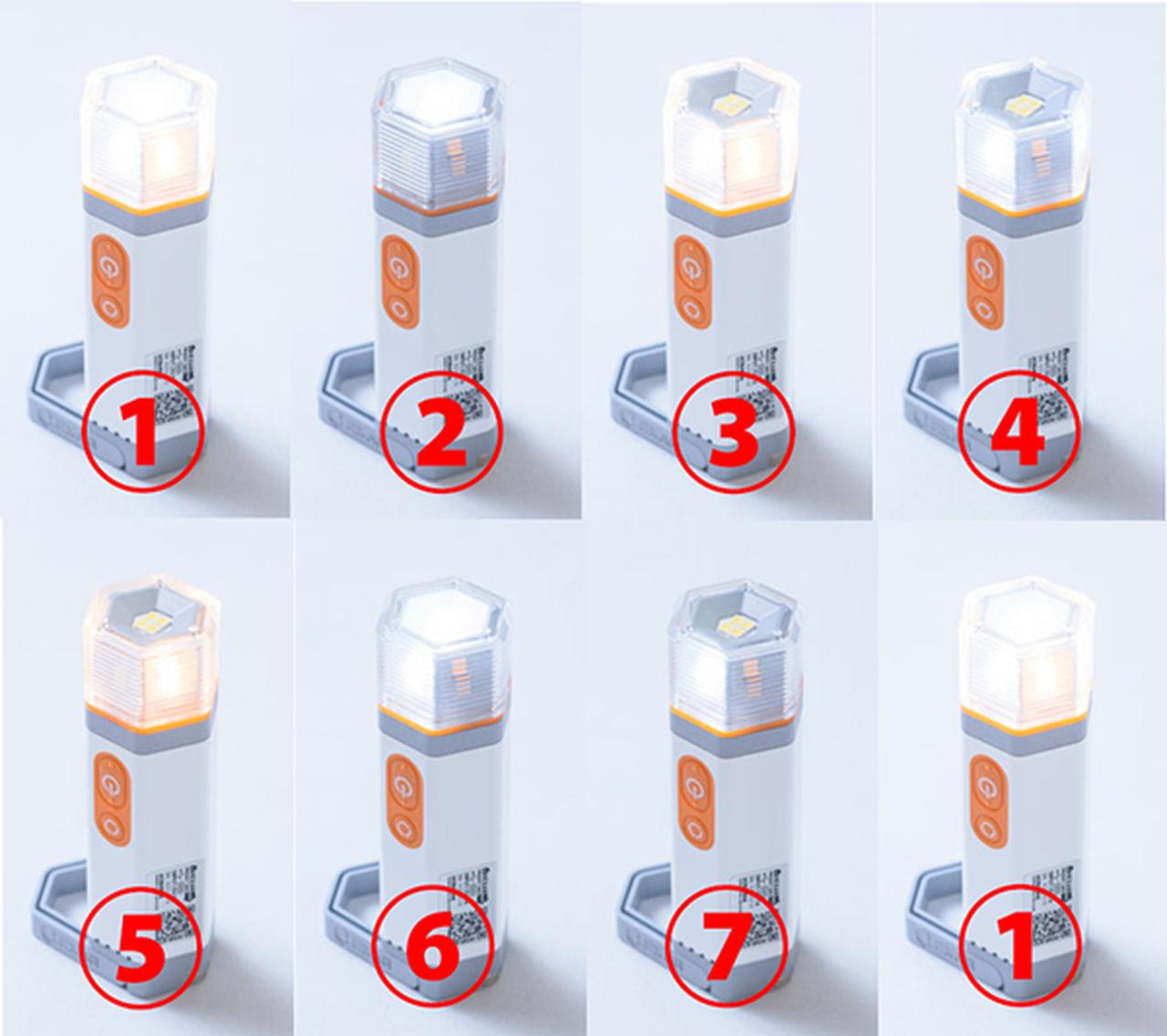 7つの発光モードのようす。発光モード切替ボタンを押して切り替えます。循環式ですが不要なモードの削除も可能で、自分の好みに合わせてカスタマイズできます。