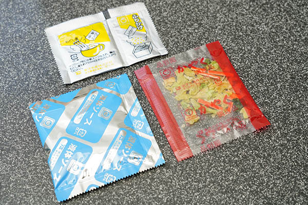 パッケージを開けると麺、ソース、具材(かやく)と、白胡椒といりごまのふりかけ、中華スープ(ねぎ入り)がいっしょになったパッケージが入っています。