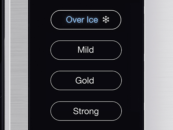 付属のガラスジャグに氷をセットし「Over Ice」を選択し「Strong」ボタンを押せば、抽出したコーヒーを氷で急冷し、アイスコーヒーも淹れることができる。氷から出る水分とのバランスを計算し尽くした風味豊かな味わいの「アイスコーヒー」モードや、コーヒーとは異なる独立した経路から、70℃ / 75℃ / 80℃ / 85℃ / 90℃ / 95℃の6段階の給湯が可能な「給湯」モードも搭載しており、お茶や紅茶も最適な温度で淹れることが可能となっている。