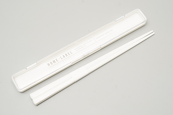 デザインテイストなどが統一された「ホームレーベル 箸(ケース付) ホワイト」(別売)も導入。「ホームレーベル 全真空ステンレスランチジャー1500用バッグ」に収納スペースがないのが残念。