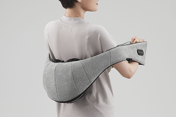 本製品は、マッサージサロンで施術されるような、両手で包み込んでしっかりもまれるマッサージを追及。そのため形状を刷新し、もみ玉が突出している立体的なデザインを採用した。独自設計のもみ玉が首筋をしっかり捉えてはさみこみながら、背中部分のローラーにはヒーターを搭載し、温めながら優しくさするようにマッサージしてくれる。