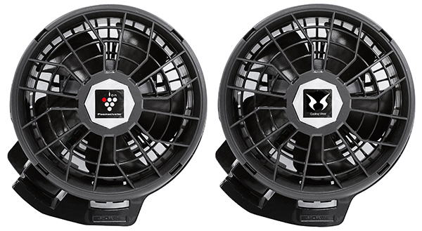ファンセットの内容は、ハイパワーファン2個(RD9330PC×1・RD9310PH×1)、ファン用ケーブル1本。電源は、24V仕様バッテリー(別売)。連続使用時間は、「弱」が約12時間、「中」が約6.5時間、「ブースト(強)※」が30分+「中」約5時間。 ※ブースト(強)は、30分稼働後、自動的に「中」運転に移行。