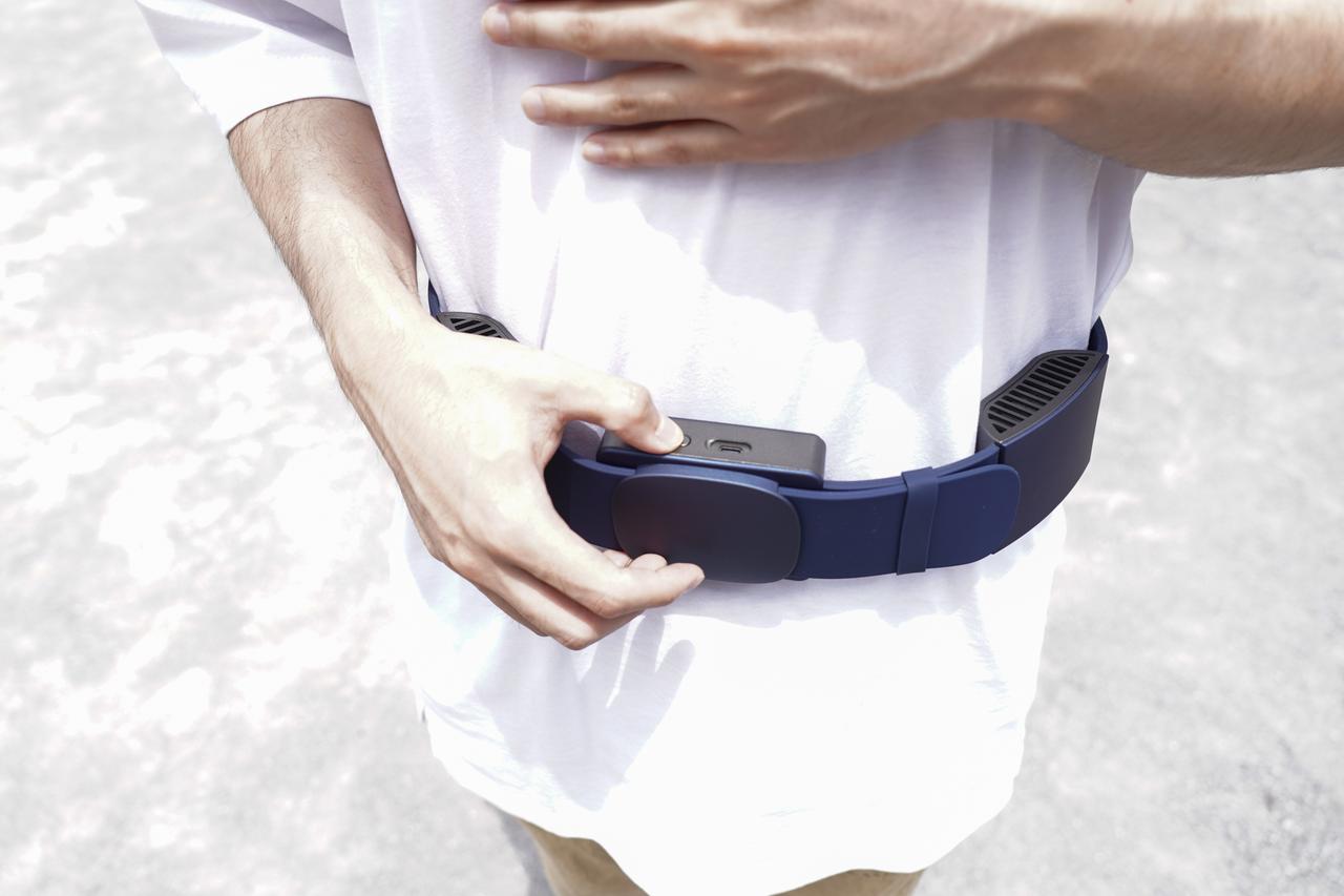 使い方は、腰の部分にベルトのように巻いて、本体スイッチをオンするだけ。風量は3段階に切り替え可能だ。約3〜4時間のUSB充電で、最大約4時間(弱モー ド時)の駆動を実現。ずっとファンを回し続けるのではなく、ピーク時を見計らって使う必要があるかもしれない。