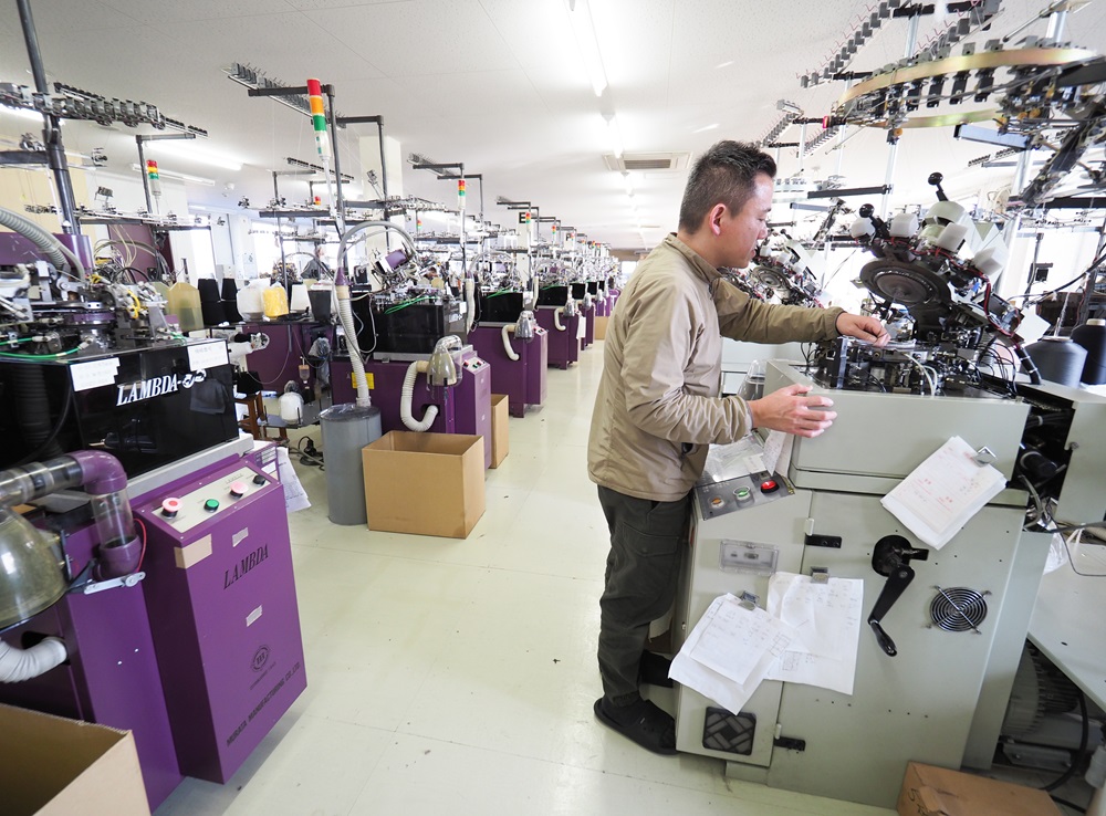 編み機など機器がズラリと並ぶ自社工場。平山さんは掃除や点検も行う