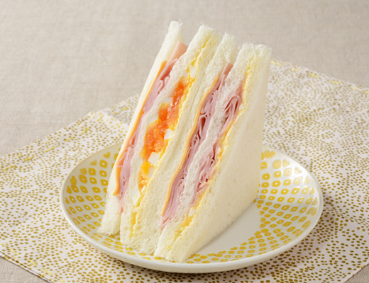 人気の具材のハム、チーズ、たまごが楽しめるサンドイッチ。1包装当り261kcal、糖質23.0g。