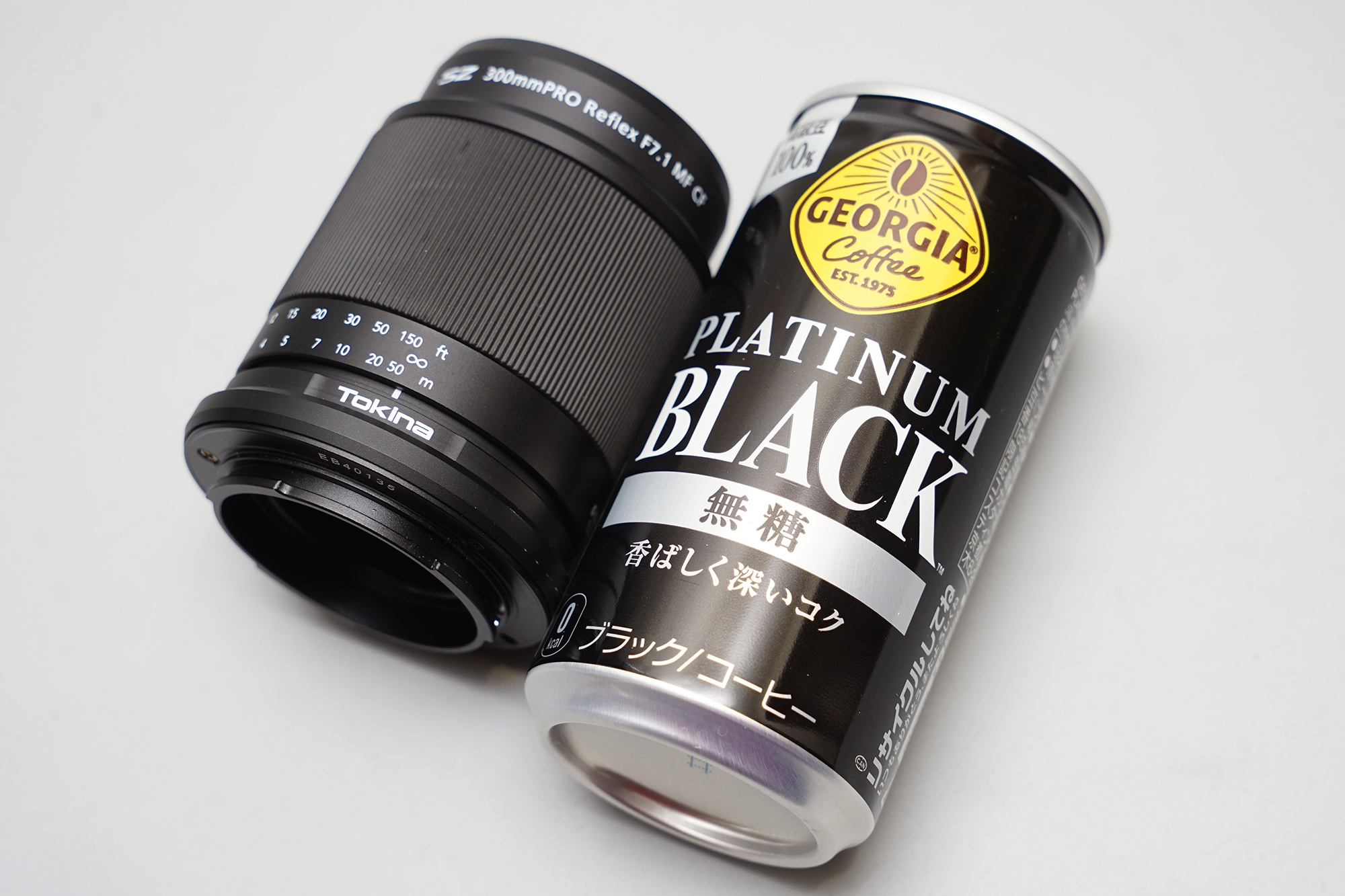 ショートサイズの缶コーヒー、写真は185g缶に比べても小さい『Tokina SZ 300mmPRO Reflex F7.1 MF CF』は、このサイズで450mm相当の超望遠撮影が可能。