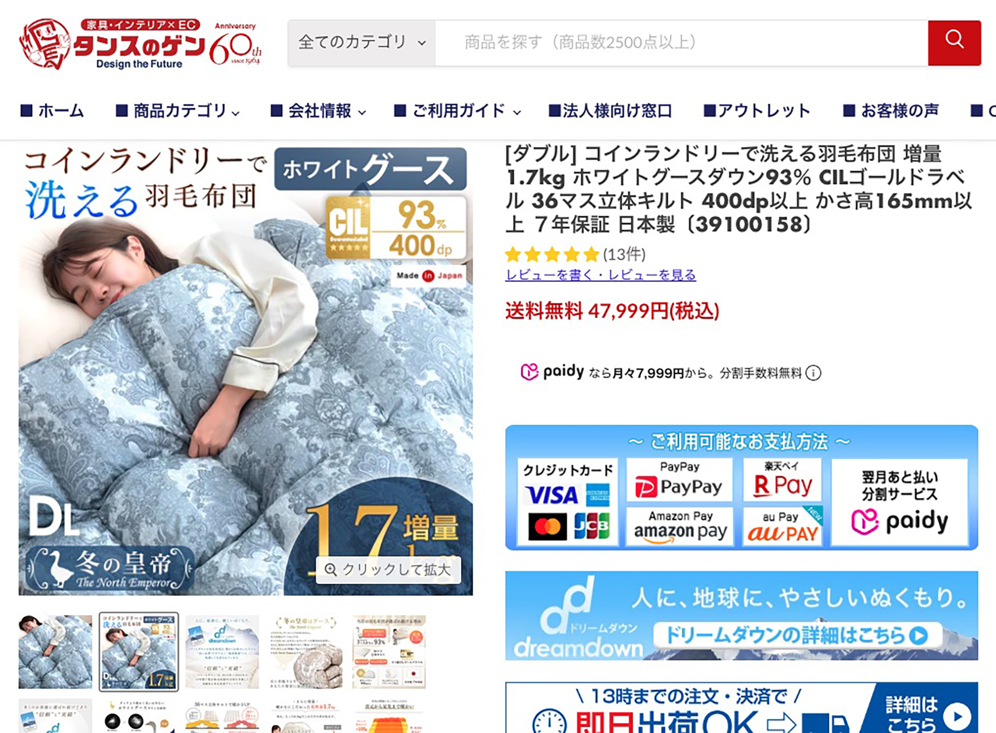 さらに羽毛布団はお安いものではないので、少なくても5シーズン(5年)、できることなら10シーズン(10年)くらい使いたいと思っていた筆者にとって「羽毛布団『冬の皇帝』」の日本製で7年の長期保証が付いていることも安心できるポイントといえます。これらの条件をクリアしている「羽毛布団『冬の皇帝』」ですが、導入時の価格はダブルサイズで送料・税込47,999円とかなり現実的なお値段です。