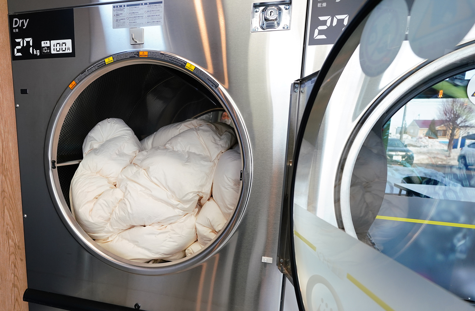 「WASH & ENJOY コインランドリー」千歳清流店の場合、大型の乾燥機は16kgタイプと27kgタイプがあるのですが、価格は16kgタイプが12分100円、27kgタイプが10分100円です。容量に対して実は27kgタイプがかなりお得になっています。大きいサイズの羽毛布団を乾燥する場合は大容量の乾燥機のほうがしっかり乾き、ふっくら仕上がるので、店舗によって価格差は異なりますが、大容量の乾燥機を使用することも検討するとよいでしょう。