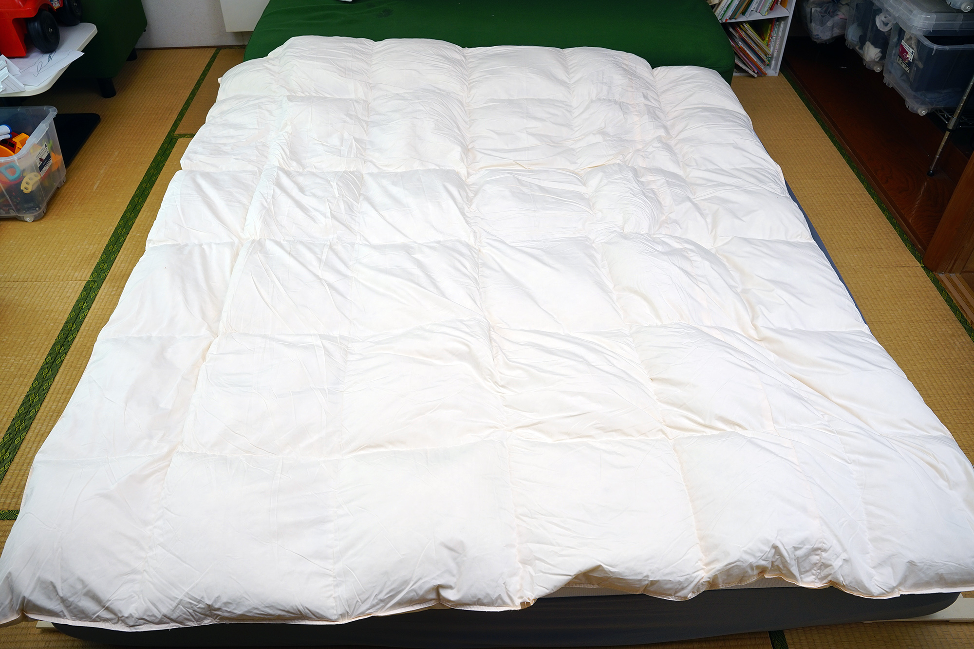 新たに導入した『ノルディック スリープ デュベ』は寒くなると妻と息子にとられてしまうので、筆者はやや古くなったダブルの羽毛布団で寝ています。この体制で特に不満は感じていなかったのですが、3歳になり、さらに寝相の悪くなった息子はかなり頻繁に掛け布団を蹴り飛ばし、筆者が布団をかけ直すとやや古くなった羽毛布団でいっしょに寝ることになります。筆者は問題を感じないのですが、やや古くなった羽毛布団を汚れてきていますし、防寒といった面でも少し心配なわけです。