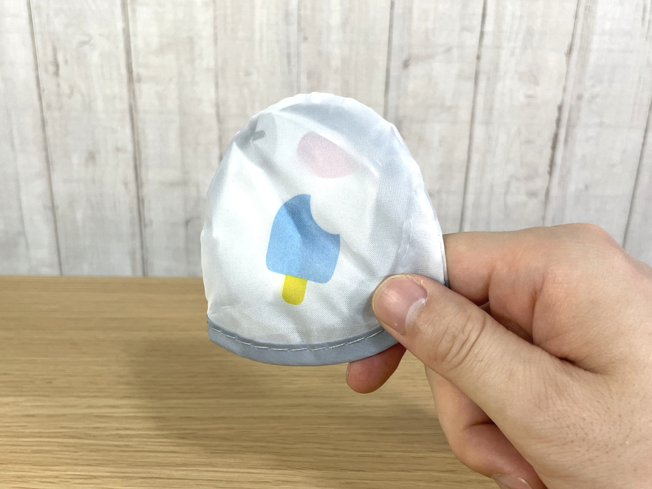 購入時は、アイスの描かれた収納袋に入った状態。このサイズで直径約8cmほど(少し縦長)。手のひらサイズだ。