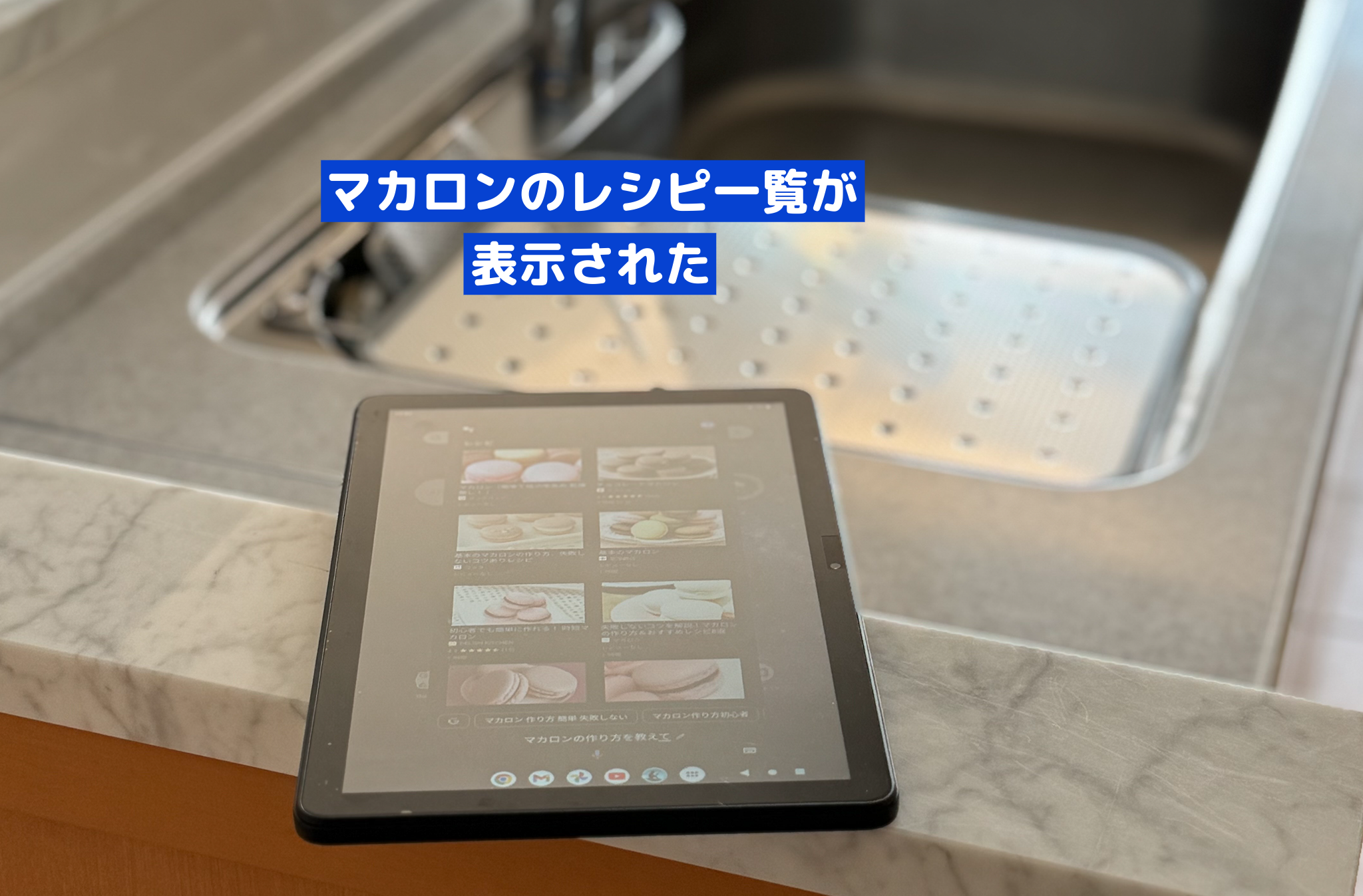 そんなときこそ、画面が大きいタブレットが重宝する。試しに「OKグーグル、マカロンの作り方を教えて」とLUCAに話しかけてみた。するとすぐにマカロンのレシピ一覧が表示された。