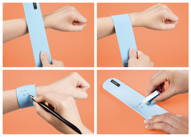 腕に巻いて使えるスマートなメモ帳で、ひらめきやスケジュールをすぐ書き留められる(メモ帳本体はコスモテック社製「wemo」)。