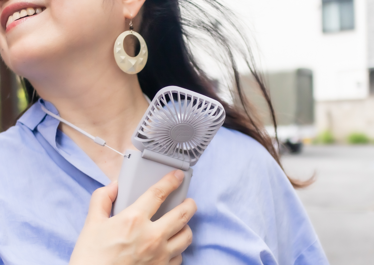 もちろん冷えすぎには注意して。冷房が効いた室内では、温度調整が必要だ。なお、「ハンディファン」を使用する際には、極度に首回りに近づけ過ぎると髪の毛が機械に巻き込まれるおそれがあるため、髪をまとめるなどして注意しよう。